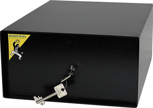 Der Mobil-Safe wird aus 2,5/3 mm SM-Stahl gefertigt und ist mit einem schlag- und kratzfestem Pulver beschichtet.