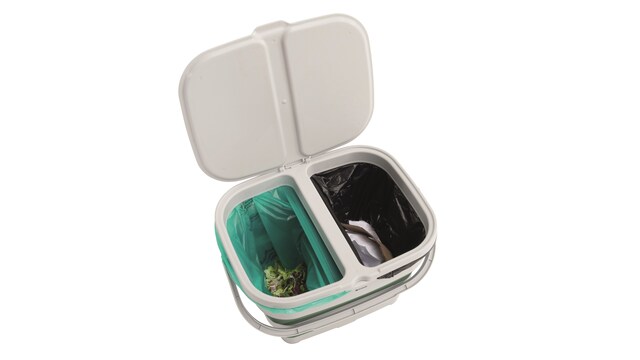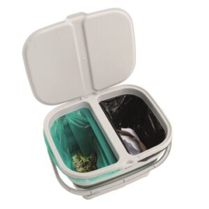 Mit dem Collaps RecycleIt Eimer mit zwei Fächern und Deckel können Sie Ihre Abfälle bequem in Tüten sortieren und gleichzeitig Gerüche und Insekten bekämpfen. Nehmen Sie den Deckel und den Rand ab, um ihn als Korb zu verwenden, oder falten Sie ihn zusammen, um Platz zu sparen, wenn er nicht gebraucht wird.