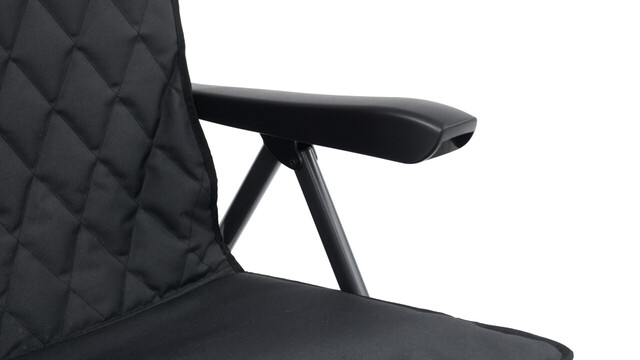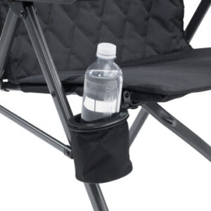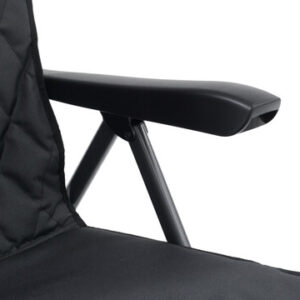 Vollständig gepolsterter Sitz mit hoher Rückenlehne in 3 Positionen für perfekten Ess- und Entspannungskomfort, getragen von einem langlebigen, hochfesten, pulverbeschichteten Stahlrahmen mit breiten Kunststoffarmen. Mit Becherhalter und kleinem Packmaß.