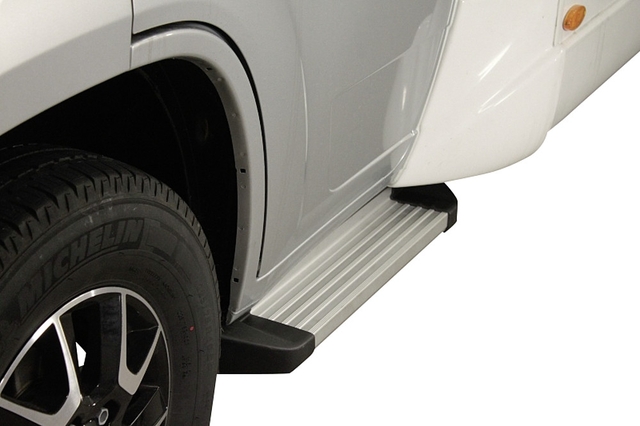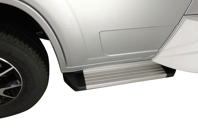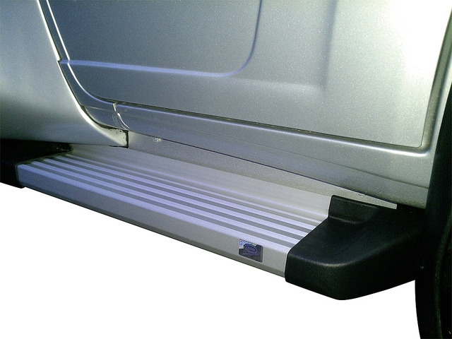 Die Zusatz-Trittstufen werden durch fahrzeugspezifische und mitgelieferte Edelstahlkonsolen am und unter dem Fahrzeugholm fest verschraubt.