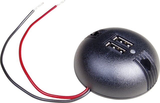 Die USB Doppelsteckdose mit integriertem Spannungswandler ist mit blauer Kontroll-LED zur Spannungsanzeige ausgestattet. Es wird Schutz vor Verpolung, Überlast, Übertemperatur, Überspannung und Kurzschluss geboten. Die Befestigung wird mittels Schrauben gewährleistet und der Kabelanschluss vorkonfektioniert ist ca. 15 cm, 2 x 0,5 mm².