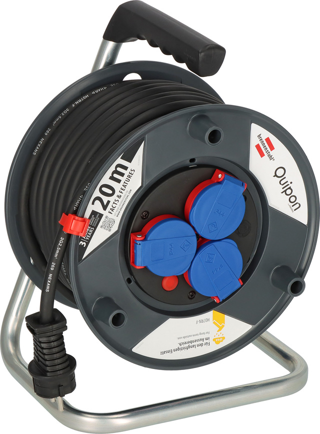 Quipon Kabeltrommel SPIN 20 m schwarz 3 x 2,5 RN-F Kabel 3 SchuKo-Steckdosen