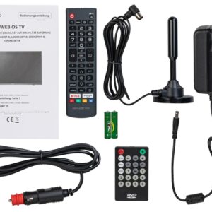 Inklusive 12 V Adapter, 230 V Netzteil, Fernbedienung, aktiver DVBT Antenne und Standfuss (abnehmbar).