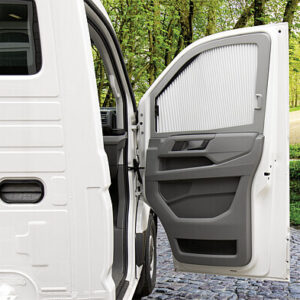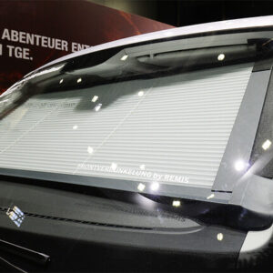 Einfache und schnelle Abdunkelung und Privatsphäre durch das an der Frontscheibe mittig verschließbare Verdunkelungssystem mit dem integrierten Magnetverschluss (links – rechts- Schieberichtung). Die Seitenfenster sind komplett vormontiert und werden lediglich am Fahrzeug-Türrahmen befestigt. Alle Teile der REMIfront-Fahrerhausverdunkelung fügen sich perfekt in das Innendesign ein. Belüftungsöffnungen werden durch die Verdunkelung nicht verdeckt.