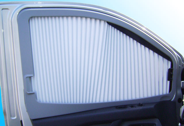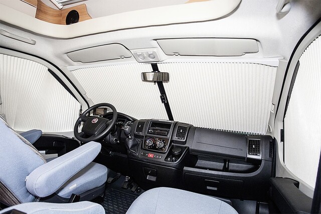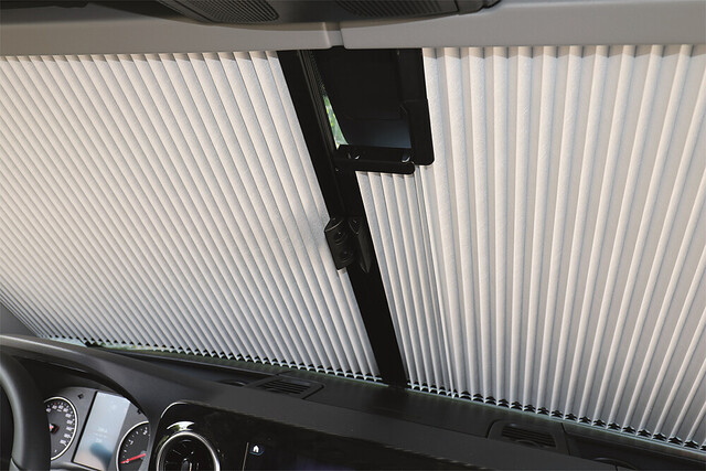 - Fahrerhausverdunklung bestehend aus dem Plissee-Faltsystem für die Frontscheibe und den beiden Verdunklungen für die Seitenscheiben