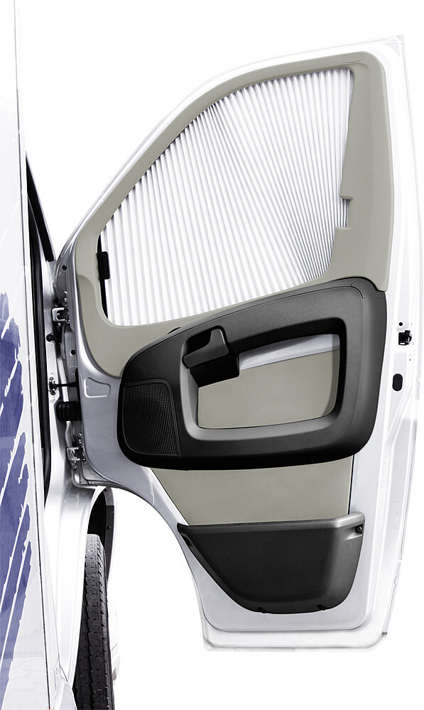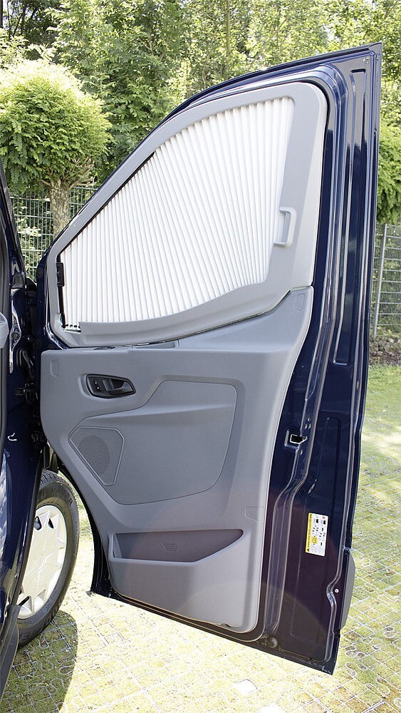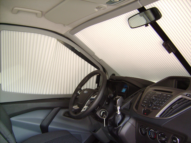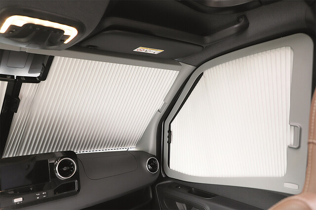 - Fahrerhausverdunklung bestehend aus dem Plissee-Faltsystem für die Frontscheibe und den beiden Verdunklungen für die Seitenscheiben