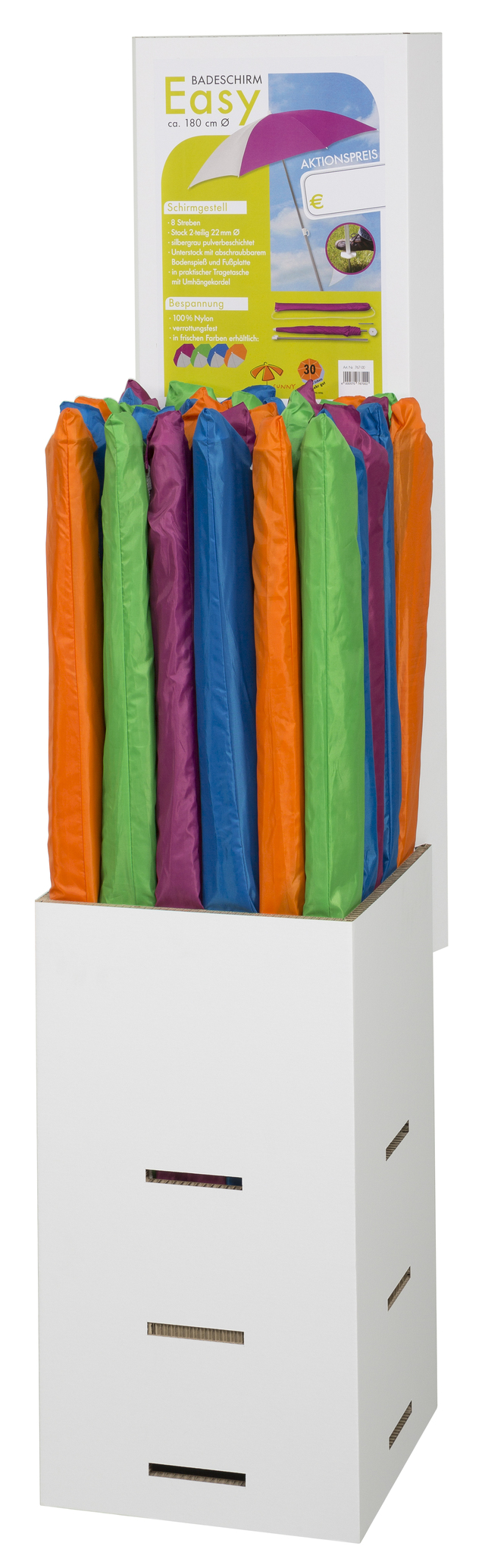 Bespannung aus Nylon, in praktischer Tragetasche mit Umhängekordel, runder Schirm mit ca. 180 cm Durchmesser