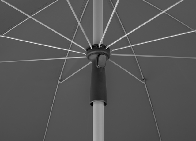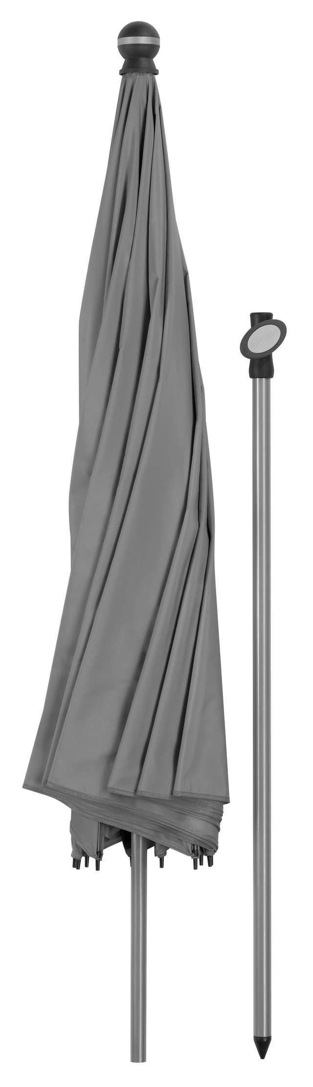 Bespannung 100 % Polyester, ca. 160 g/m², verrottungsfest, wasserabstoßend imprägniert, ohne Volant, mit Bandeinfassung, runder Schirm mit ca. 220 cm Ø.Gestell silbergrau pulverbeschichtet, alle Kunststoffteile anthrazitgrau, großer Schieber mit Taste, Drehfeststeller, Kugeltop, Metall-Knicker mit Druckknopf, Stock 2-teilig 22/25 mm Ø.
