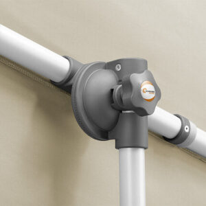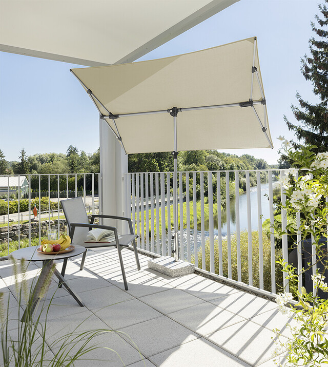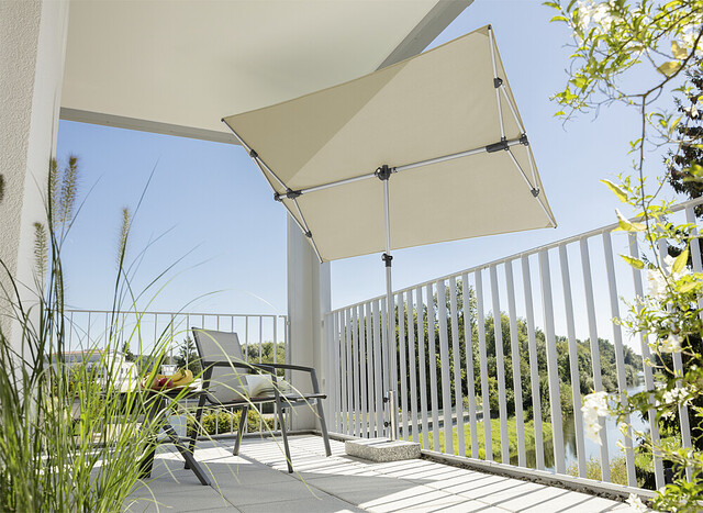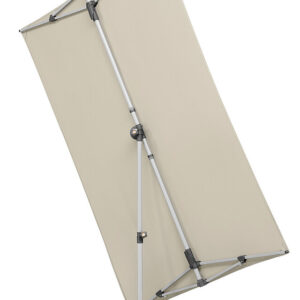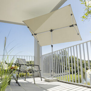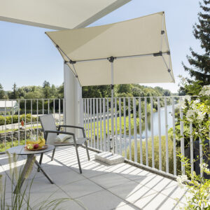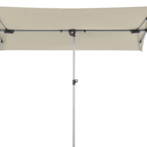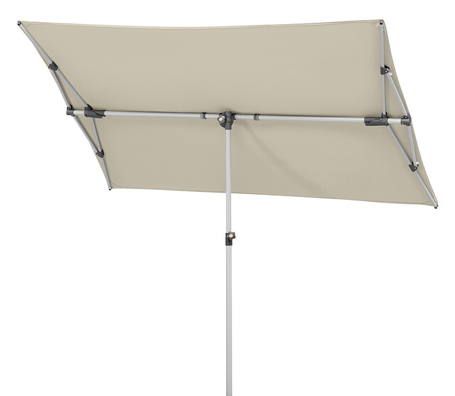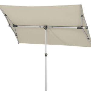Wasserabstoßend imprägniert, verrottungsfest, Rechteckiger Schirm mit einer Größe von ca. 190 x 140 cm. Stock 2-teilig mit Ø 32 mm, in alle Richtungen dreh- und schwenkbar, Schirm bis zu 20 cm seitlich verschiebbar und bis zu 69 cm in der Höhe verstellbar. Auch ideal als Sichtschutz.