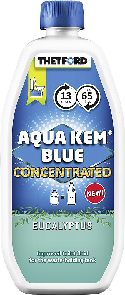 Aqua Kem Blue Concentrated Eucalyptus ist eines der neuesten Mitglieder der bekannten Concentrated-Familie von Thetford! Aqua Kem Blue Concentrated Eucalyptus hinterlässt einen Duft von Wellness in Ihrem Wohnmobil! Angenehmer Eukalyptusduft mit einem Hauch von Minze. Eine Dosierung reicht bis zu 5 Tage. Praktische kleine Falsche, weniger Gewicht*. Deutlich verbesserte Fäkalzersetzung für eine leichtere Tankentleerung*. Deutlich verbesserte Reduzierung der Gasbildung* (*im Vergleich zu Aqua* Kem Blue).