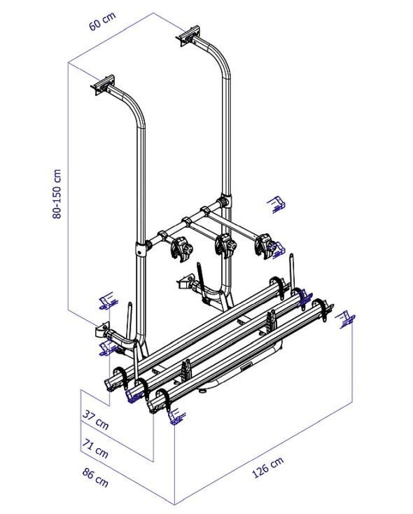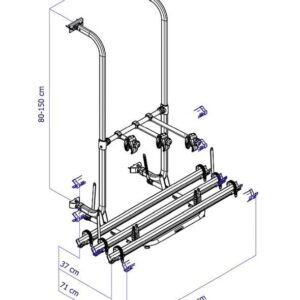 Für die vertikale Rückwand von Reisemobilen /Wohnwagen, passend für Carado, Sunlight, Dethleffs. Verstellbare Schienen von links nach rechts. Die Felgenhaltebänder blockieren die Fahrräder während dem Transport und die verschiebbare Fahrradrahmenhalter halten die Räder in Position. Die Plattform wird manuell verriegelt und kann leicht in der Aufwärtsbewegung eingerastet werden, wenn sie nicht in Gebrauch ist.