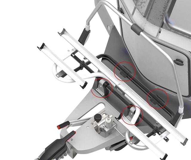 Der spezial Stahl-Anbausatz wird am Deichselrohr angeschraubt, die Alu-Deichselverkleidung kann montiert werden. Zur Verstärkung des Systems ist eine zusätzliche Anbindung an der Bug-Spitze vorgesehen.