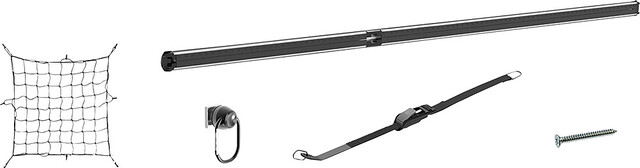 | Lieferumfang | Inklusive 2 Schienensatz, 6 Knöpfe, 2 Gurt, 1 Netz, 10 Schrauben |