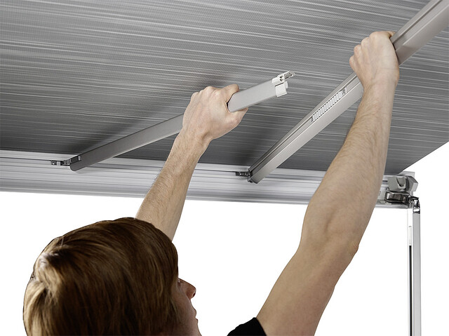 - Optional ist eine Schiene erhältlich, die den Zwischenraum unter der Markise verschließt. Die Schiene hat zwei Funktionen: An ihr lässt sich ein Thule Markisen-Zelt oder ein Thule LED Strip befestigen