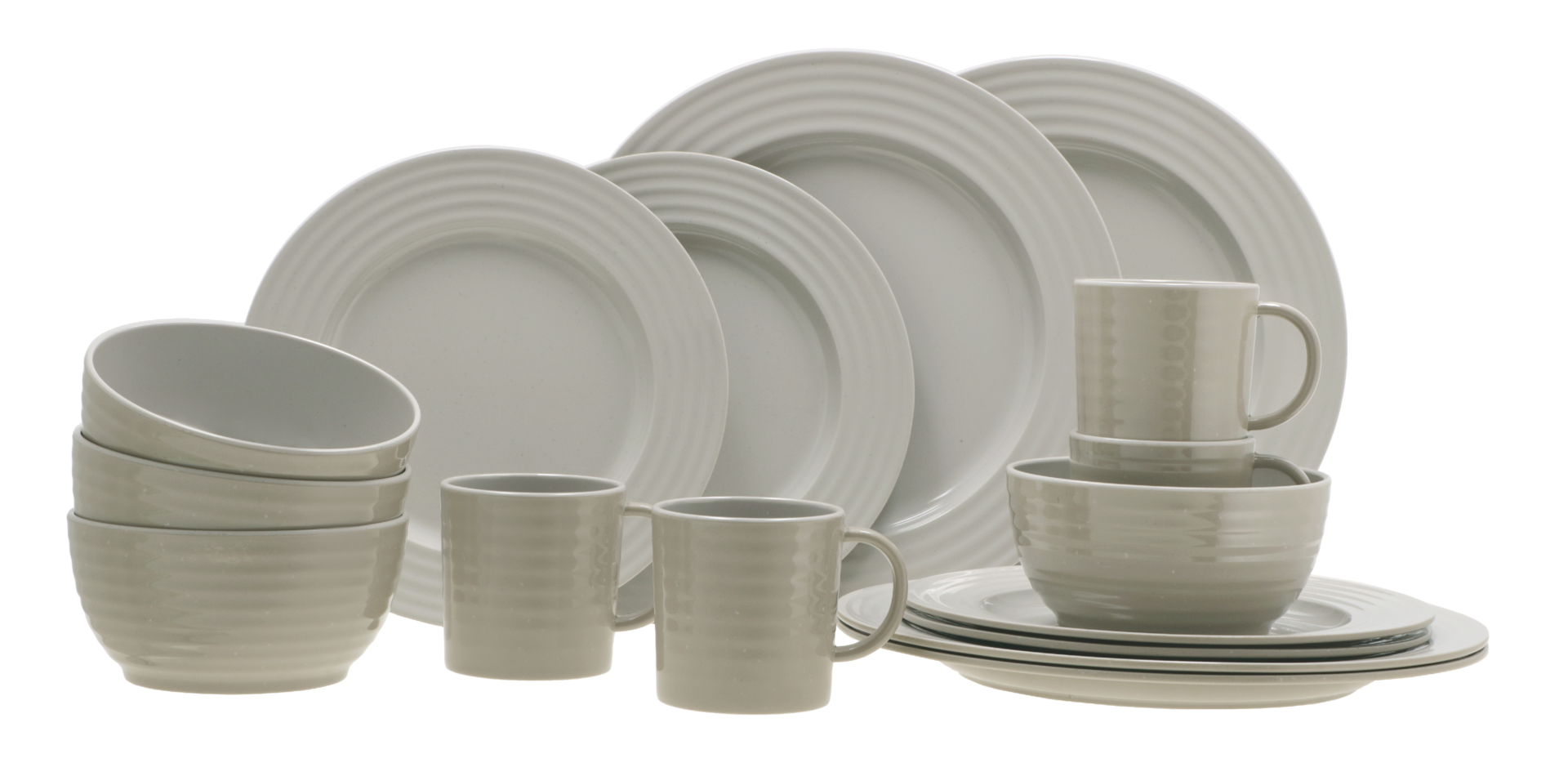 und Teller sind zweifarbig: Sie haben eine helle Innenseite und eine dunklere Außenseite. Set bestehend aus 4 Tassen 225 ml, 4 Schalen ø 13 cm, 4 Dessertellern ø 23 cm und 4 Esstellern ø 28 cm.