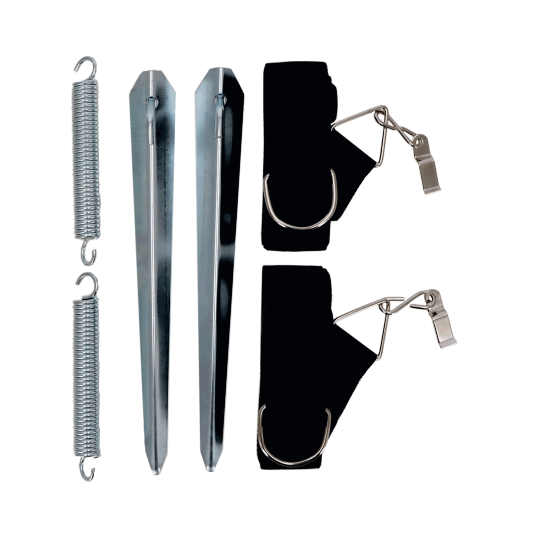 Universal Sturmsicherungs-Kit, bestehend aus extralangem Gurt (13 m x 50 mm), Spiralfeder (15 cm) und zwei Heringen (38 cm). Optimal zur sturmsicheren Verankerung von Markisen und Vorzelten.