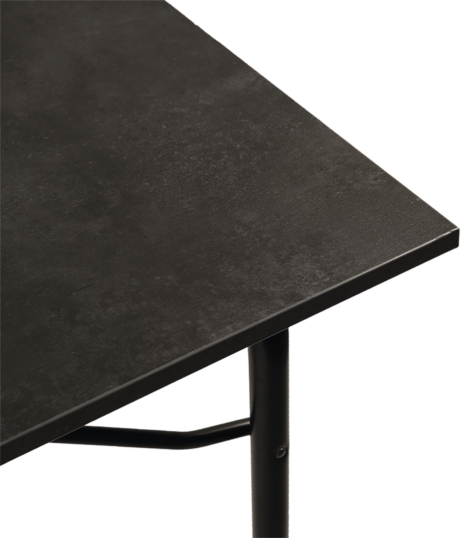 Robuster Tisch mit kratzfester und hitzebeständiger (bis 180 °C) Sevelit-Tischplatte und Stahlgestell. Alle Tischbeine sind stufenlos von 63 – 83 cm teleskopierbar. Belastbarkeit max. 50 kg.