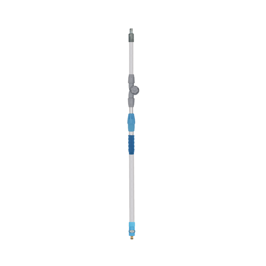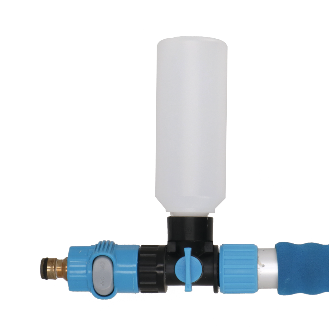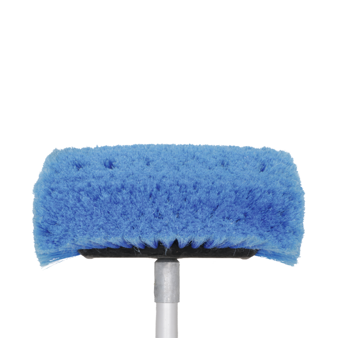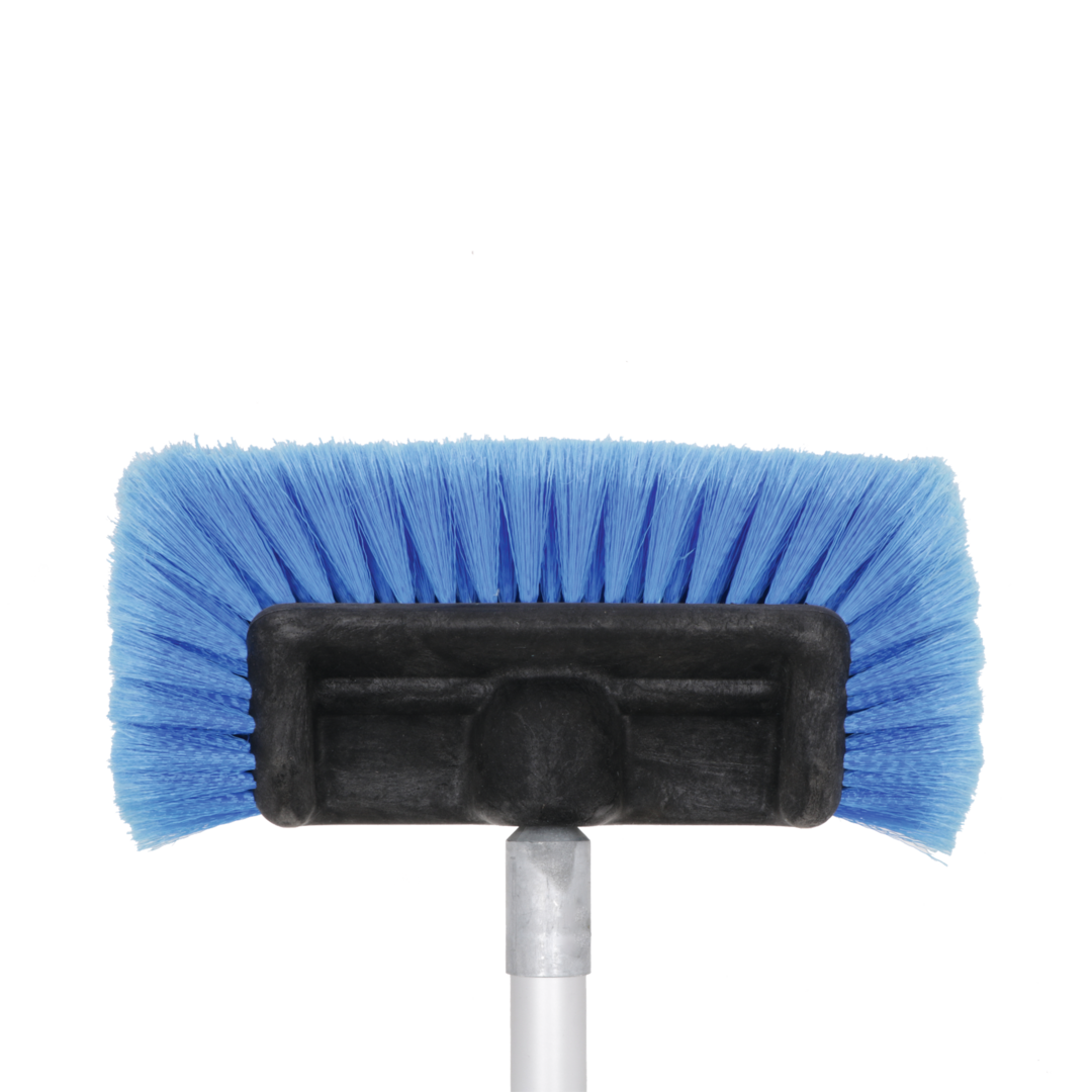 Waschbürste mit Polyesterspitzen und zusätzlichen Seitenbürsten. Eingebauter Shampoo-Anschluss und -Regler, Gardena-Wasseranschluss aus Messing und Alu-Teleskopstab (Länge 135 – 245 cm, ø 30 mm) mit zusätzlich verstellbarem Gelenkstück (Extra-Auszug 95 – 177 cm).