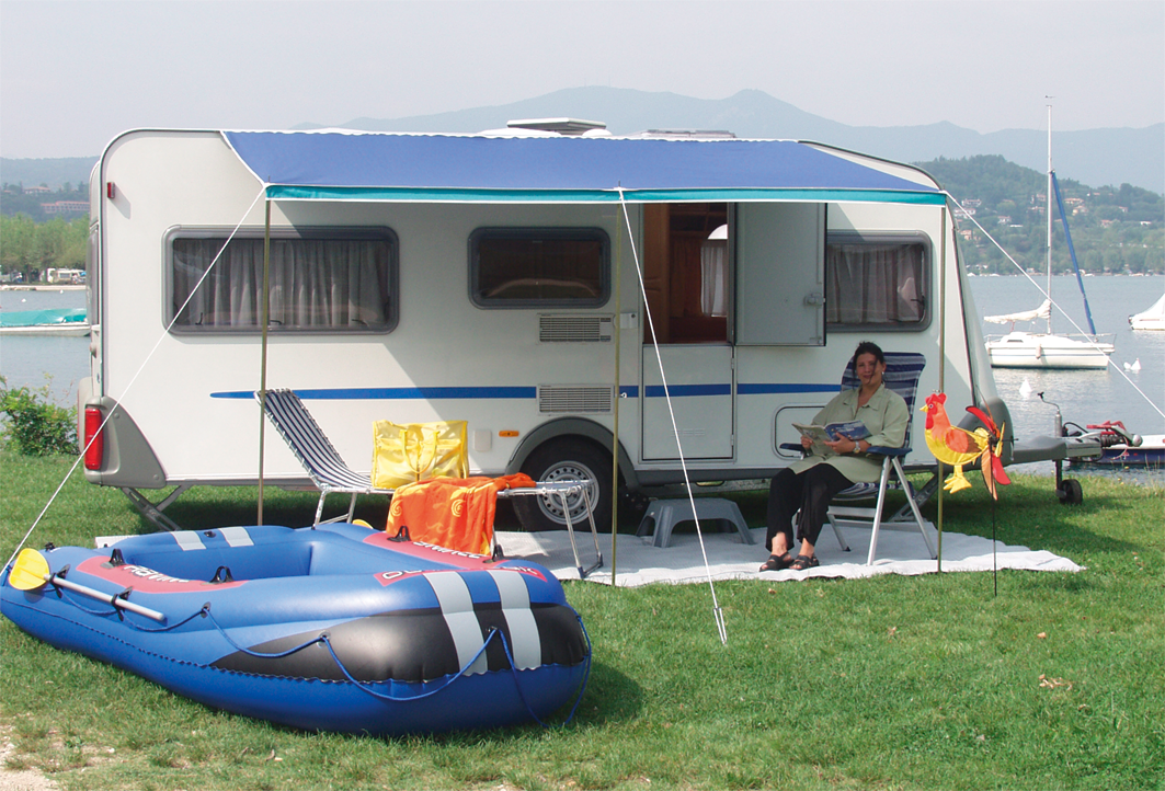 Sonnenvordach Carashade. Die Vielseitigkeit zeichnet dieses Sonnendach aus: Es ist nicht nur als herkömmliches Sonnendach einsetzbar, sondern auch als Überdachung des Gasflaschenkastens und der Deichsel an der Bugseite des Caravans, als Carport für Ihr Auto während des Campings oder als große Seitenwandmarkise an Ihrem Vorzelt. Bei diesem Sonnenvordach können Sie zwischen drei Farbvarianten auswählen: