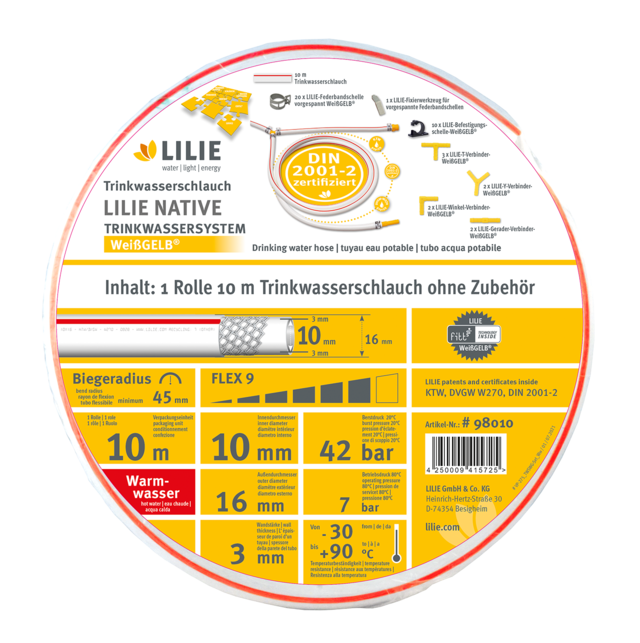 Trinkwasserschlauch Lilie ohne Zubehör, 10 m Rolle Warmwasser