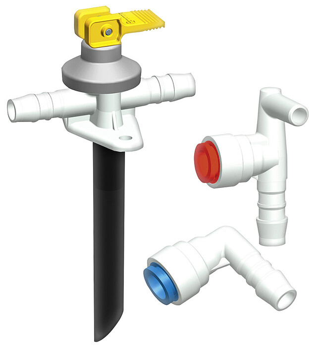 Das Set besteht aus dem stromlosen Ablassventil, den Winkelanschlüssen TB für Wasserschläuche Ø 10 mm und einem weichen und schwarzen PVC-Schlauch. (TB = Tannenbaum)