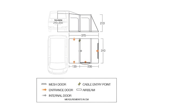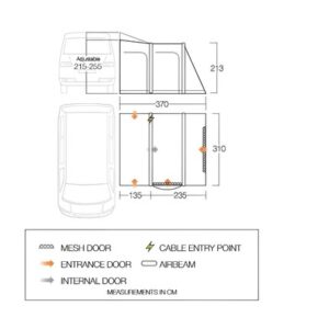 - Kabeleinführung – Führen Sie Elektrokabel in Ihr Vorzelt ein, damit Sie Ihre Campinggeräte problemlos mit Strom versorgen können.