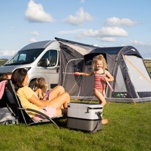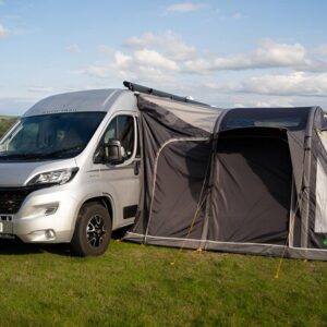- Aufrollbarer Verbindungstunnel – Nehmen Sie Ihre Markise ab, wenn Sie für den Tag wegfahren, rollen Sie den Tunnel einfach zurück und sichern Sie ihn mit einem Knebel.