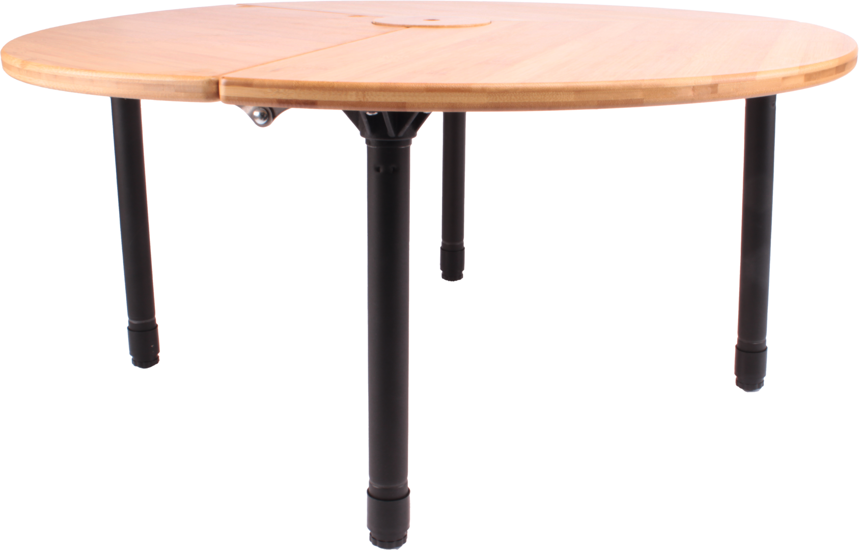 Dieser runde Tisch aus Bambus und Aluminium hat eine Platte, die in drei Teile gefaltet werden kann. Er lässt sich einfach auf- und abbauen und ist leicht zu transportieren. Das mattschwarze Gestell kann dank der ausziehbaren Beine auf zwei Höhen eingestellt werden. Der Tisch wird in einer praktischen Aufbewahrungstasche geliefert.