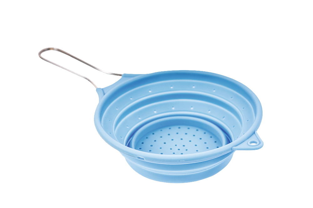 Platzsparend im gefalteten Zustand. Material Silikon, Griff Edelstahl.