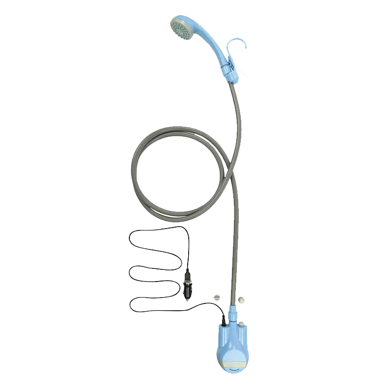 Eigenschaften: USB-Kabelaufladung, 1,8 m Duschschlauch mit Brausekopf, Zubehör zum Aufhängen, Betrieb mittels eingebauter Lithium-Batterie. Leistung 2,5 l/min.