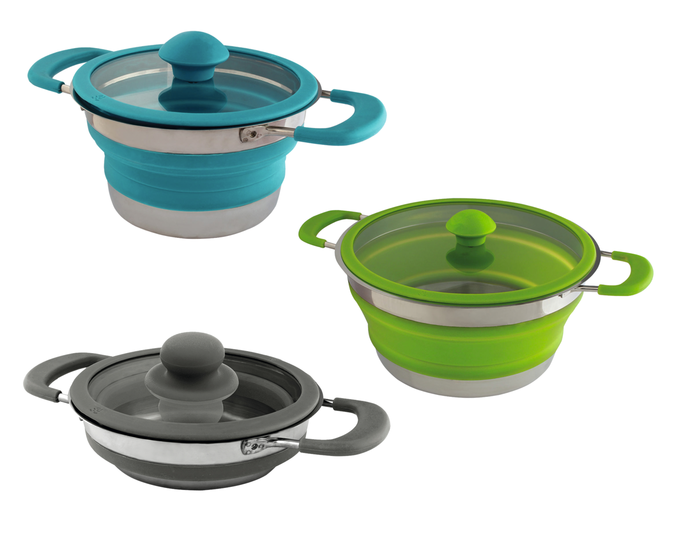 Faltbar – Pfanne/Topf inklusive Deckel aus Silikon, Boden aus rostfreiem Stahl.