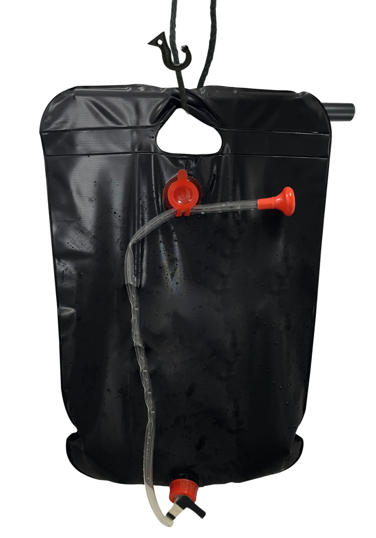 Solardusche. Einfach aufhängen und duschen. Warmes Wasser durch Sonnenenergie. Selbst bei wechselhaftem Wetter erwärmt sich das Wasser im ca. 20 l fassenden Behälter auf bis zu +40 °C. Solardusche aus atoxischem PVC. Regelbarer Wasserdurchfluss. Mit Trage-/Hängegriff.