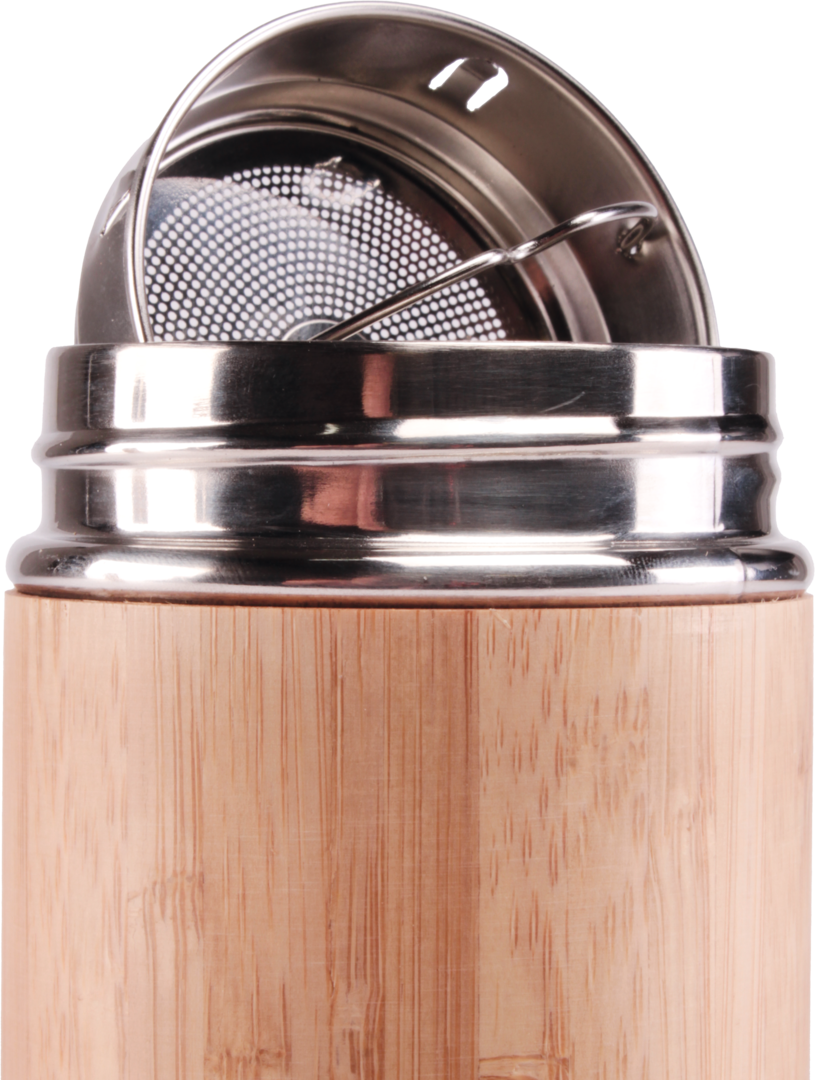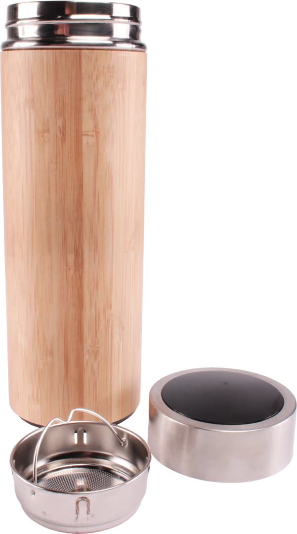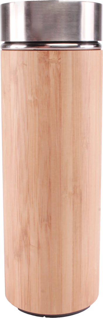 Thermosflasche aus Bambus mit Edelstahlkappe.