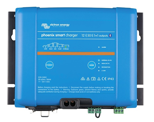 Mit Blick auf Bootsbesitzer kann dieses adaptive 5-stufige Ladegerät entweder 30A oder 50A Ladung für jede der drei Batteriebänke bereitstellen. Oder das Phoenix 1+1 Modell liefert 3A an die Starterbatterie, der Rest an die Hausbank. 24V-Modelle sind mit 16A/25A Ladung erhältlich. Bluetooth-fähig, können Sie das Ladegerät überwachen und Alarme direkt von Ihrem Handy aus einstellen. Adaptive, intelligente, dynamische Ladefunktionen – siehe Datenblatt unten. Mit DC-Anschluß Schraubklemme 16mm² (AWG6) und AC-Anschluß EC 320 C14 Eingang mit Halterung.