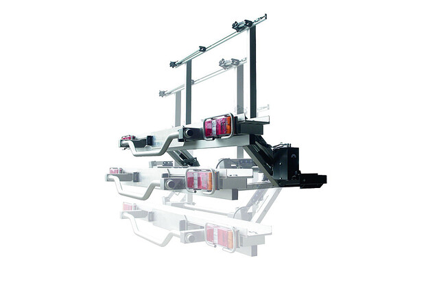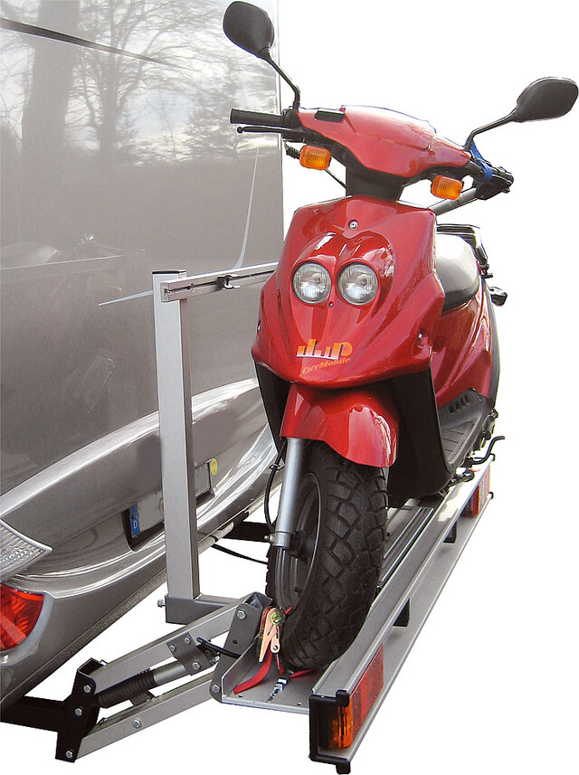 Der absenkbare/abnehmbare Motorradträger wird zum Beladen bis auf den Boden abgesenkt. Nach Befestigung des Rollers/Motorrads wird der Träger mittels Hydraulik-Fußpumpe leicht und bequem nach oben gepumpt bis er mechanisch verriegelt. Der Träger kann mit wenigen Handgriffen abgenommen bzw. angebracht werden.