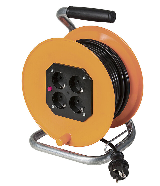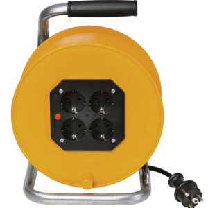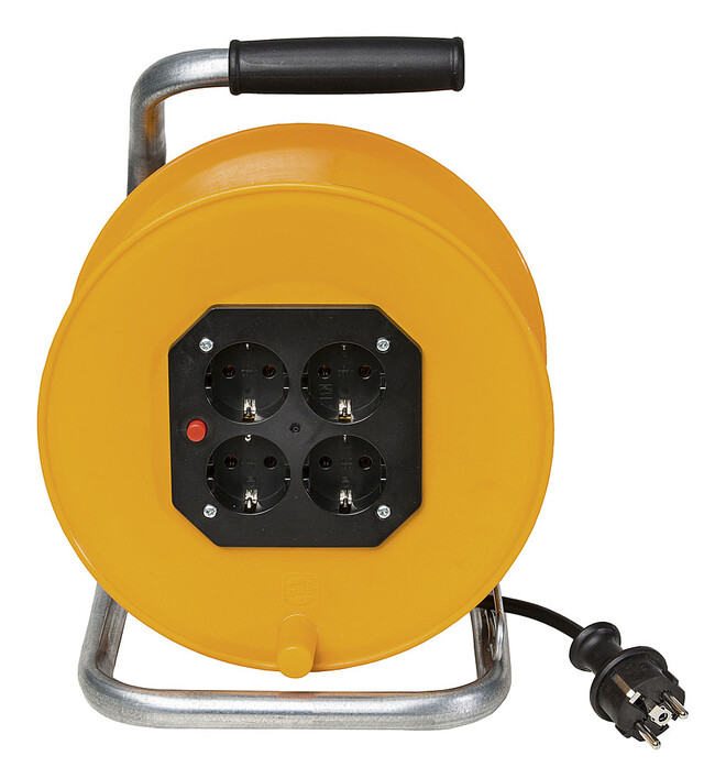 Kabeltrommel aus robustem, hochbruchfestem Spezialkunststoff, stoßdämpfendes, stabiles, verzinktes Fußgestell mit Kabelführung, Feststellbremse, VDE-Thermoschutzschalter, 4-fach Schuko-Steckdoseneinsatz zur Verwendung im trockenen Innenbereich und mit 25 m Kunststoffleitung H05VV-F 3G1,5 mm².