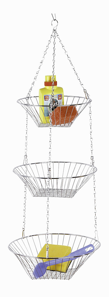 3 Ablagekörbe durch Hängeketten verbunden. Praktische, platzsparende Aufhängung an der decke. Mit Rundhaken zum Einhängen am Decken- oder Regalhaken.